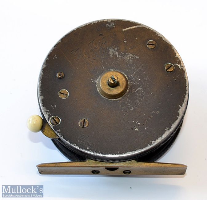 3x interesting small alloy reels – Rare smallest size Percy Wadham Newport Specialities Pat “The Test” 2.75” alloy fly reel with smooth brass foot, ivorine ball shaped rim check button, backplate spindle drag adjuster - good strong check - runs smoothly; unnamed 2.75” alloy reel with brass pillar drum core , smooth brass foot shortened one end – slight play in handle otherwise runs smoothly; and “A.S” stamped 2.5” alloy wide drum reel, with smooth brass foot, on/off check, brass drum core, strong check - runs well