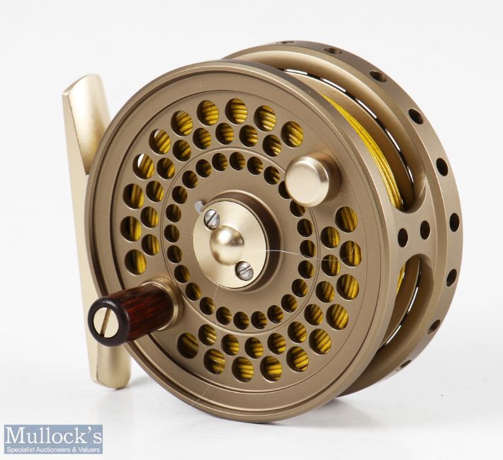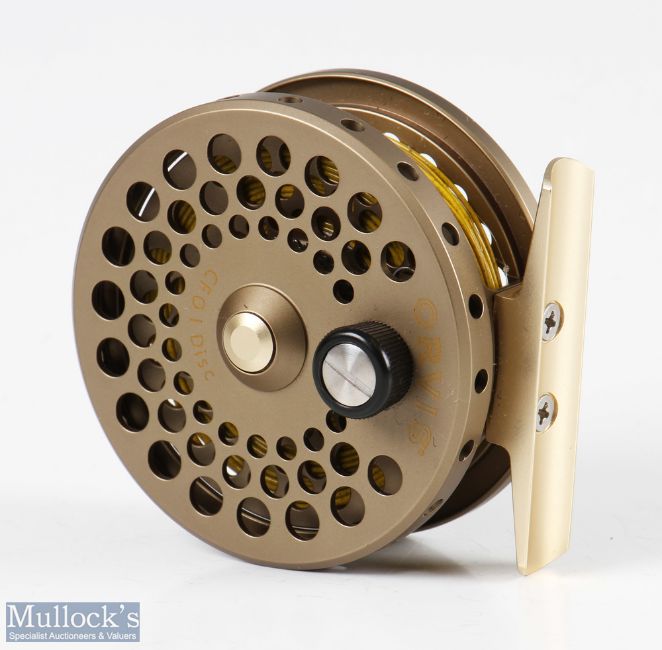 Orvis CFO I Disc 2 ¾” bronzed fly reel with perforated body, rear drag adjuster, smooth foot, loaded with line, appears unused, with maker’s zip case