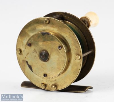 Jones Maker c1880, 3” all brass Salmon winch reel inscribed Jones, Maker 111 Jermyn St, London curved crank handle, rear raised check housing, constant check, triple cage pillars, runs smooth, with line, overall good condition