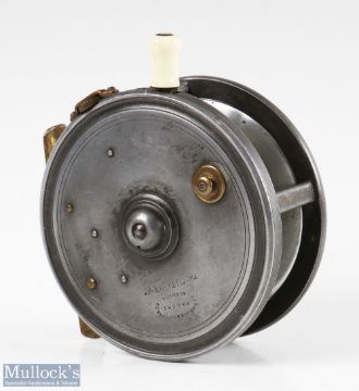 J.J.S. Walker Bampton The Utility 4” alloy casting reel twin handle, smooth brass foot, strapped rim tensioner, on/off check, spins well, line wear, slight kink in foot, overall good example