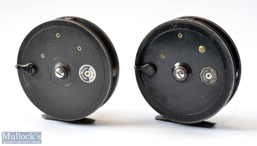 2x Good 4” x centre pin trotting reels – Allcocks Flick-Em black alloy reel , 2x screw drum release latch, and tension adjuster, on/off check – some rim paint wear – runs smoothly; and similar style J W Young & Son The Rapidex retaining most of the original black bobble finish – runs smoothly