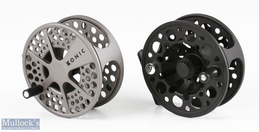 Redington Surge 7/8/9 disc drag large arbour fly reel finished in black, appears unused with cloth bag and maker’s card box together with a Waterworks Lamson Konic 4 large arbour fly reel finished in grey, drag adjuster to reverse, appears unused, in maker’s cloth bag and box (2)