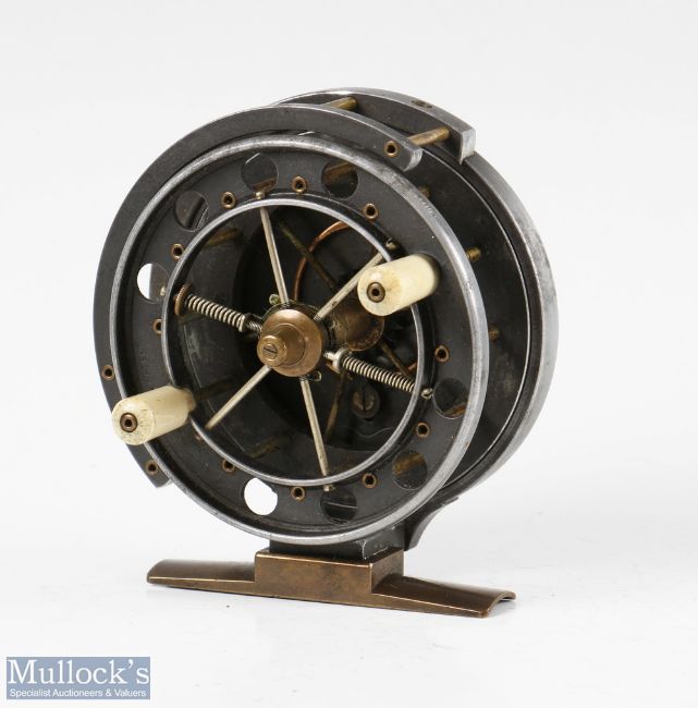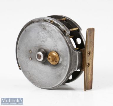 Rare S Allcock & Co 3” Aerial centrepin reel c1914-1925 ventilated front flange drum stamped Patent, BP line guide, smooth brass foot, twin handles, six spoke, on/off check, spins forever