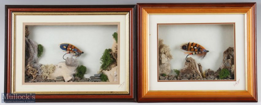 2 Eric Sayers of Preston Framed Salmon Flies both in 3d frames with scenic decorations, frames signed to lower right corners (2)