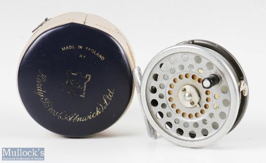 Hardy Bros England Marquis #6 alloy trout fly reel with alloy smooth foot, line guide, loaded with line, spins well, signs of use, with maker’s zip case
