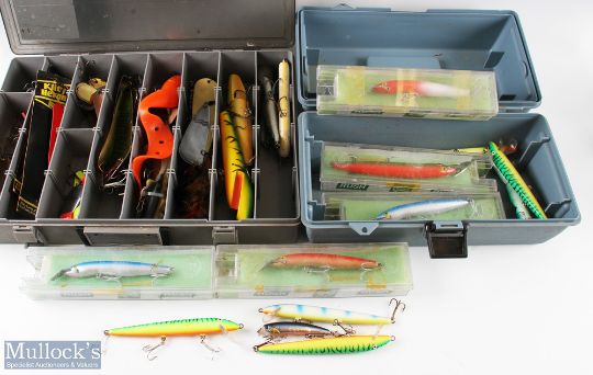Assorted fishing lures featuring approx. 40+ new and used large predator lures – Replicants, Spoons, Jerkbaits and Plugs including examples by Kilty, Masterline and Landa – within 2x plastic boxes