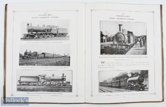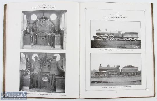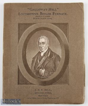 Galloway-Hill Locomotive Boiler Furnace, Ordnance Works, Sheffield. Circa 1910 Publication an impressive large 54 page Presentation publication detailing their Patent Locomotive Furnace with many photographs of Locomotives in Britain and Overseas as far away as New Zealand and Japan that are fitted with this product. Plus technical illustrations and drawings with detailing text. Printed on finest thick semi-gloss paper in card cover the front is embossed and with tipped in portrait of George Stevenson. A no expense spared publication tied in Silk cord. Size 9¾” x 12”