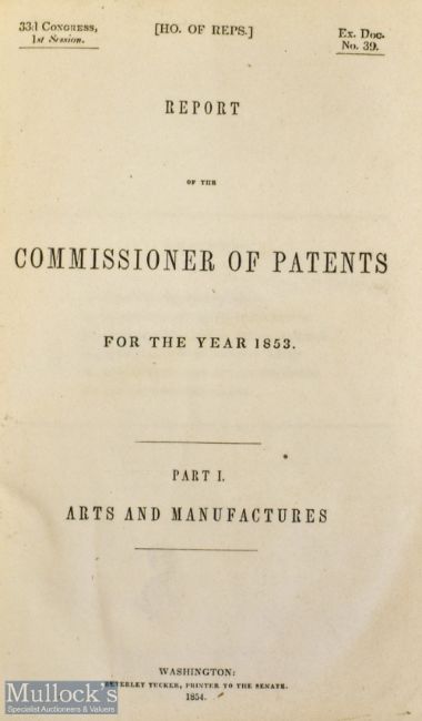 Americana – Mormon – Signature of John M Bernhisel – Report of the Commissioner of Patents for the Year 1853 Part I arts and Manufacture with presentation inscription ‘Geo A Smith by favour of Hon J.M. Bernhisel’ who was a Mormon pioneer and close friend of Brigham Young, he was the original delegate to the US Federal Government for Utah Territory. George A Smith was an early leader of the Mormons and was one of the Quorum of Twelve, he is said to be influential in the Mountain Meadows Massacre 1857, 510pp, Washington 1854 containing lists of patents mostly illustrated with cuts, embossed cloth, faded and worn, pages mostly clean with bookplate for LDS Historians Office, Salt Lake City