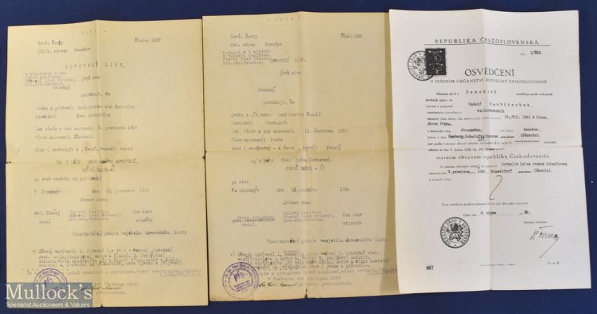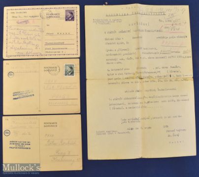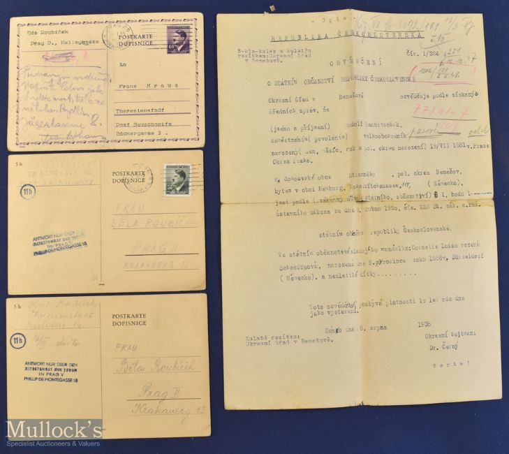 WWII Prisoner Postcard and Letters from Theresienstadt Concentration Camp dated 24 Jan 1944, with associated letters in Czech, names Roubicek/Rubitschek appear on postcards and letters, types with hand written notes (7)