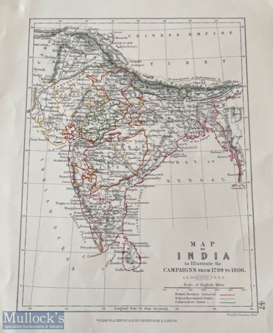 India Map - Original 19th century map of India to illustrate military campaigns from 1799 to 1806. Hand coloured throughout published by William Blackwood & Sons London c1800s. Dimension 26 x 21.5cm