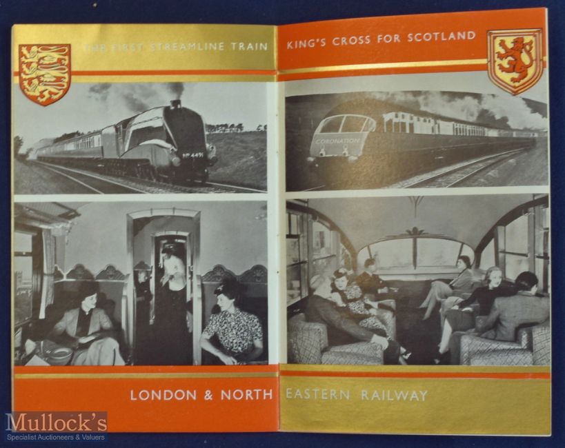 The Coronation The First Streamline Train Kings Cross For Scotland 28th Sept 1937. An attractive 16 page publicity booklet, timetable, plan of seating in carriages, map, restaurant tariff etc. Also giving interesting information regarding this then new train. Printed on fine gloss paper in gold, red and black and in illustrated card cover, size 4½” x 6”.