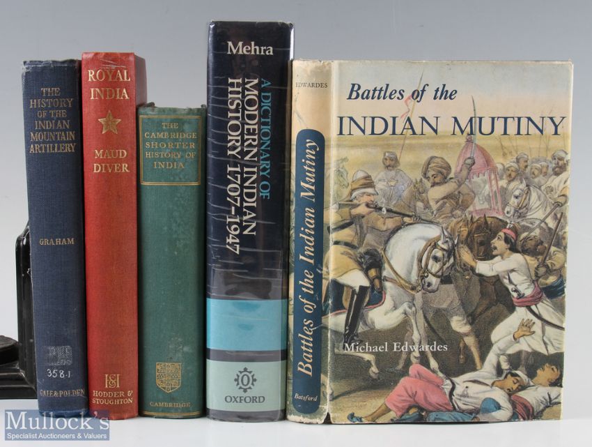 India History Books including The Cambridge Shorter History of India by Allan, Wolseley Haig and Dodwell, 1934, Battles of the Indian Mutiny by Michael Edwardes 1963, A Dictionary of Modern Indian History 1707-1947 by Parshotam Mehra, The History of the Indian Mountain Artillery by Brig-General C.A.L. Graham 1957 and Royal India by M Diver 1942 - all HB, some with DJs (5)