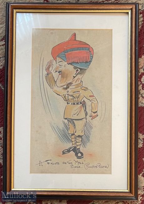 India - c1920s/1930s original water colour British caricature showing British officer of the Punjab police Salute on the mall Simla, mounted on acid free board and fine period wooden frame with gold gilt. dimensions 46 x 31cm