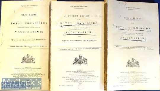 United Kingdom – Royal Commission on Vaccination 1889-1897 1st, 2nd, 4th 5th and final reports, in 4x parts with maps and diagrams, covering historical aspects of infectious diseases and vaccination, with emphasis on Sheffield, Ireland, Leicester and dissent on Dr Collin’s and Mr Picton on compulsory vaccination. All lacking blue wraps and disbound, scuffed, 2nd report very brittle. With appendix 3-9, plus fold out maps including Warrington 12” to 1 mile and Leicester 6” to 1 mile and many other maps and diagrams, includes out breaks of small pox in Dewsbury, London, Warrington, Leicester, Gloucester, Glasgow, Liverpool etc 1891 to1896, 7 parts in original blue wraps, bound as one, no covers. Up until this time vaccination had been compulsory with fines for noncompliance Box