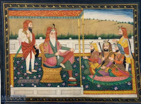 India & Punjab – Sikh Noble in Durbar Miniature - Large Punjab school miniature painting of a Maharajah Ranjit Singh with a Sikh attendant, detailed and elaborate gouache with finely painted borders, measures 31cms x 24cms