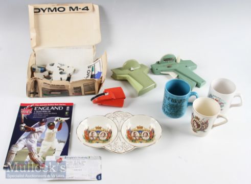 England v Australia 2009 Ashes Test Match Programme and Ticket with a small selection of Royalty commemorative ceramics and 2 Dymo label guns