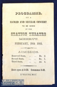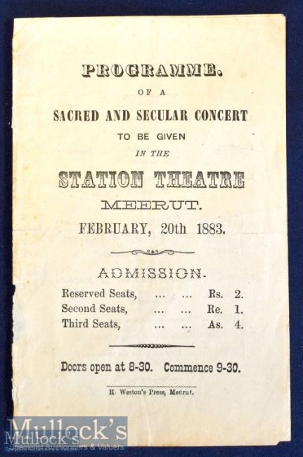 Meerut India Station Theatre Sacred & Secular Concert Programme 20 FEB 9.30. 1883 A 4 page programme of music by Mendelsohn, Gounod and others. Printed by H. Weston's Press, Meerut. Size folded 4½” x 7”.