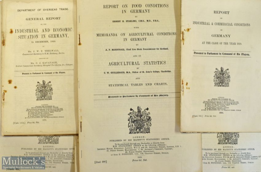 WWI United Kingdom Government Document – Report relating to economic and political conditions prevailing in Germany 1919-1921 with reports by British Officers Dec 18-Apr19, Ditto Apr 19, Ditto Mar-Ap19, reports cover Bolshevist, Sparticist and Polish conflicts and food shortages along with food condition 1919, plus two other reports, scuffed with staple rust marks (6)