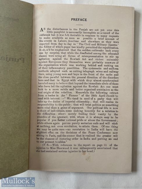 India & Punjab - Punjab disturbances April 1919 the civil and military gazette press Lahore. Published at the time in Lahore describes the events of the Amritsar massacre from the point of view of British authorities.