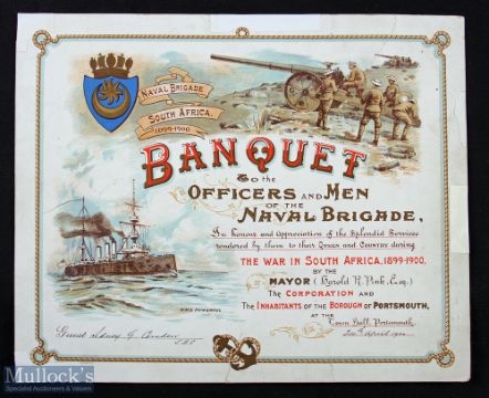 South Africa - Boer War Invitation; Banquet To The Officers And Men Of The Naval Brigade. Portsmouth 24th April 1900 Impressive Banquet Invitation featuring Naval Team working large Gun in the War in South Africa, and 4 funnel Warship. Invitation by “The Mayor The Corporation and The Inhabitants of the Borough of Portsmouth at the Town Hall”. Made out to Sidney G Conden S.B.S. Large Cromo Litho printing in card, size 13¾” x 11”.