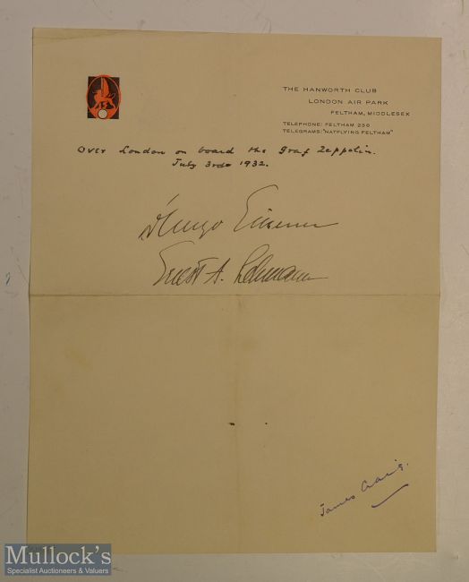 Capt. Ernst A. Lehmann Signed Note – inscribed ‘Over London on board the Graf Zeppelin July 3rd 1932’, with signatures below including Hugo Eckener, Capt. Ernst A. Lehmann and James Craig Prime Minister of Northern Ireland (1921), on The Haworth Club London headed notepaper.