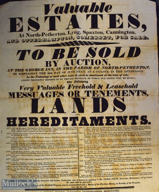 Somerset – Large Broadside ‘Valuable Estates to Be Sold by Auction’ At North-Petherton, Lyng, Spaxton, Cannington and Otterhampton, at The George Inn, J. Binning Printer, measures 45x55cm approx. heavy folds, some tears along folds and Table of the reciprocal Distances of the Principal Towns of Great Britain and Ireland published Leeds at The Mercury Office by Edward Baines, with some of the principal travelling stations of France and the Netherlands, folded, tears in places at folds, overall measures 788x55cm approx. (2)