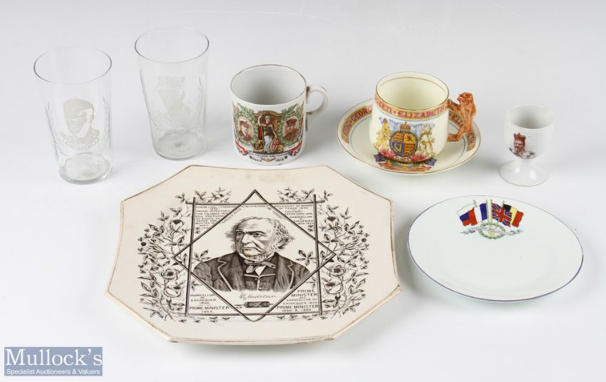 Commemorative Ceramics and Glass Selection (8) incl Victorian William Gladstone plate, Peace 1919 cup, Royal Coleston WW1 dish, Edward VII egg cup, King George VI coronation cup and saucer, 2 glass beakers engraved Eisenhower and De Gaulle (8)
