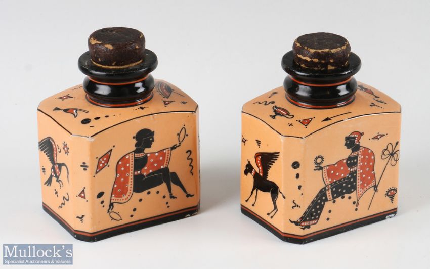 Pair of Early 20th century Ceramic Tea Caddies with Ancient Greek Style Decoration with figural and animal design in black on peach ground, with cork tops