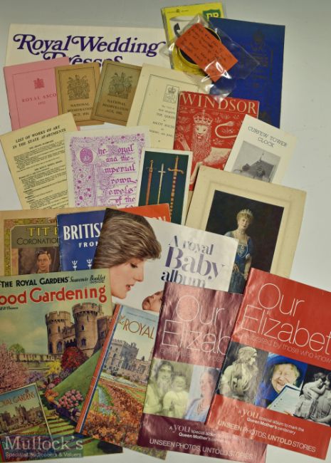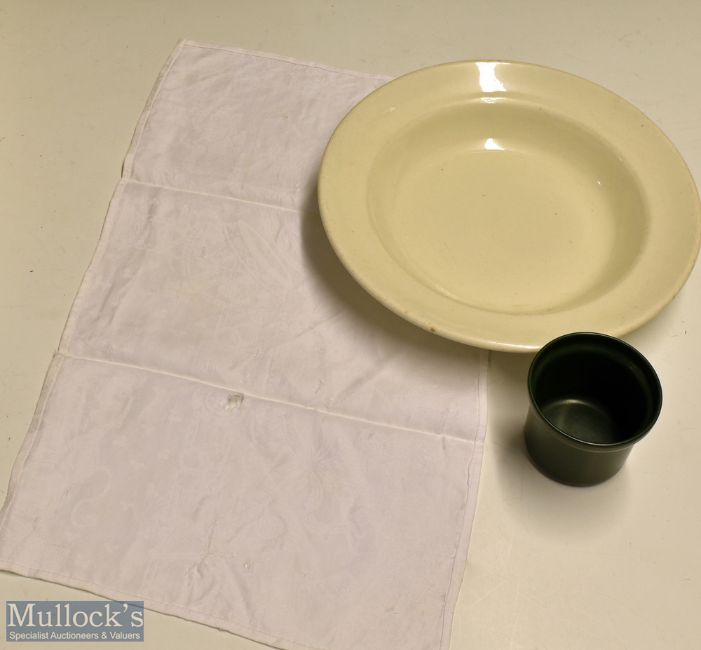Royal Ephemera Selection to include a porcelain soup bowl with ‘GviR’ King George VI cipher – marked to underside, measures 25cm diameter, plus shaving beaker with GR VI cipher to underside, plus a worn cut napkin showing floral insignia, all from a Royal Housekeeper at Windsor Castle in the 1940s and made the HRH The Queen mother’s preserves, together with a selection of pamphlets, booklets, guides and newspaper cuttings etc (Qty) Small Box