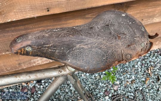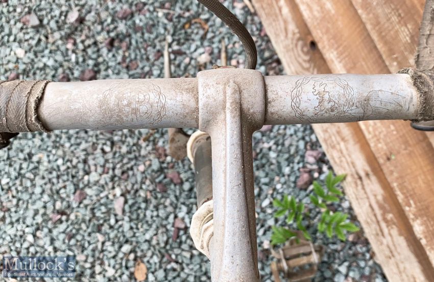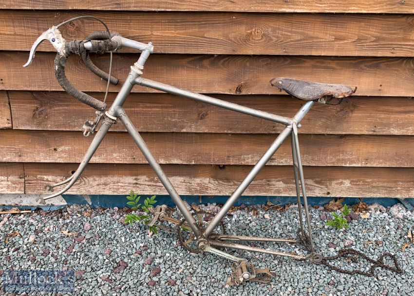 R O Harrison Lyta Lightweight Road Bike lightweight aluminium frame in silvered finish, brakes and bars by G B Sprint, wheels by Fiamme, Italy, leather saddle by Brookes and cleats by ‘Loyotard’, bike in need of overall light attention