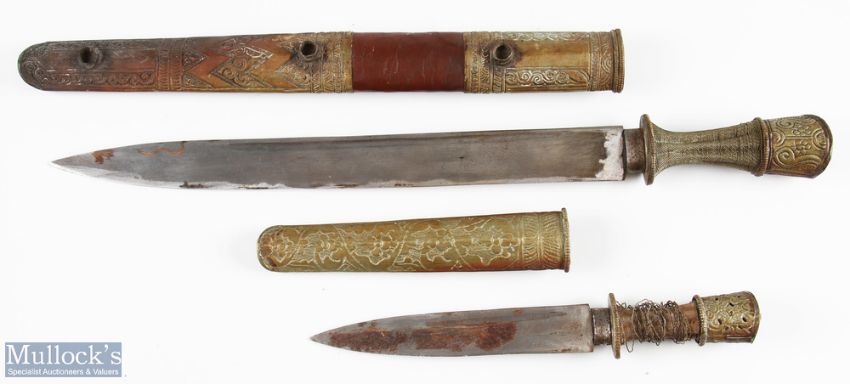 African Sword and Dagger – the Sword having a 34cm blade, tribal light metal pommel, wire wrapped grip, the dagger having a 16cm blade, tribal light metal pommel, loose wire wrapped grip, both with light metal scabbards (2)