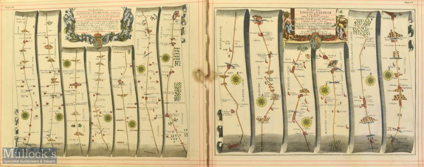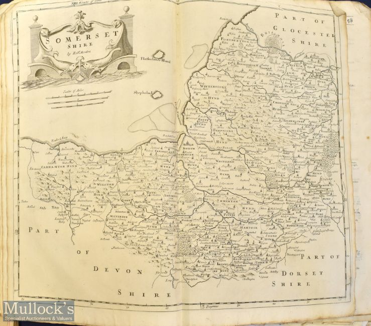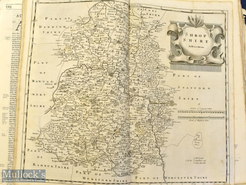 Britain, Camden (William) – Camden’s Britannia Book missing front covers and title pages, does include plates of coins and maps by Robert Morden such as Cornwall, Devon, Dorset, Somerset, Wiltshire, Hampshire, Berkshire, Oxford, Buckinghamshire, Bedfordshire, Northampton, Staffordshire, Shropshire and Cheshire, condition varies, tears, loose pages, most maps appear good overall together with Britannia Illustration of the Kingdom of England by John Ogilby with colour maps, missing covers, tears apparent, some plates missing appears 60 approx maps included, measures 32x24cm approx. (2)