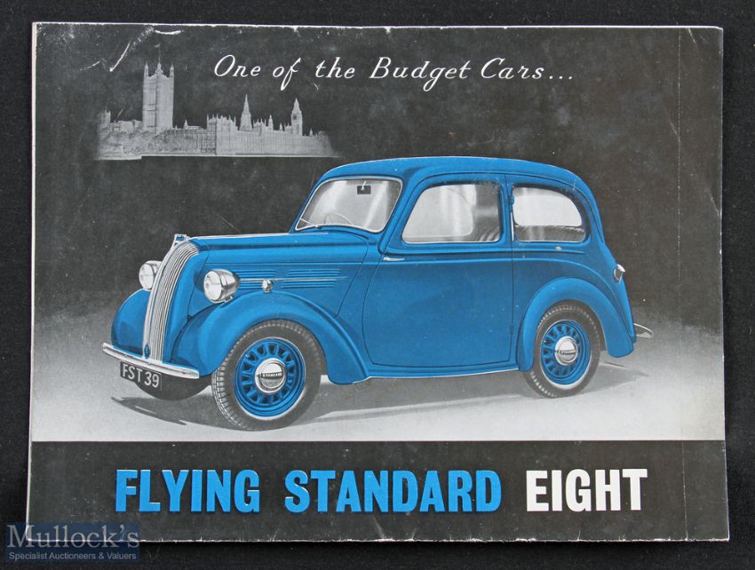 Flying Standard Eight 1939 “One of the Budget Cars” Sales Catalogue, fold out 8 page catalogue illustrating and detailing with specifications their Saloon and Open Tourer models. Manufactured in Coventry. Printed on thick semi-gloss paper, folds out to size 10” x 30”.