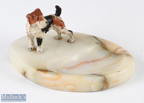 Art Deco Cold Painted Bronze Fox Terrier Onyx Dish length 18cm, overall good