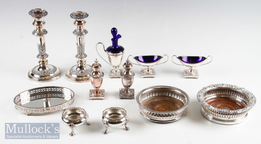Selection of Silver Plate on Copper Items incl pair of candle sticks, one a/f, 2 wine coasters, 1 split, oval dish, pair of salt cellars with no liners, pair of pedestal salt cellars with blue glass liners, one liner a/f, pair of pepperettes and an oil bottle with glass body and stopper, all showing signs of wear to plating (12)