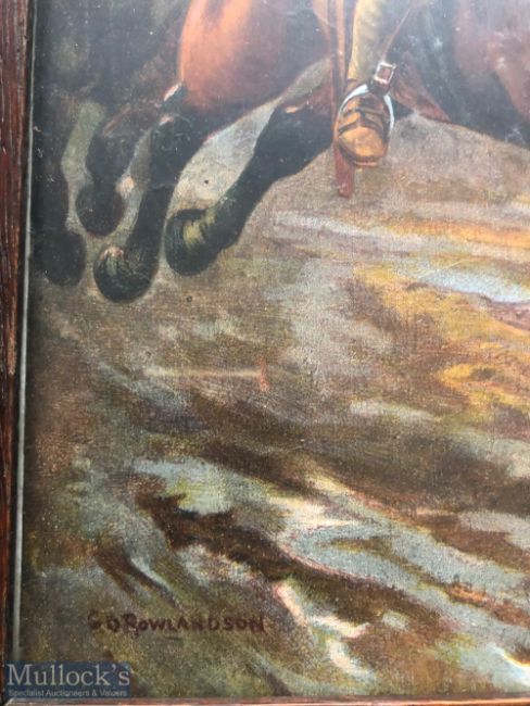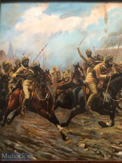 India – WWI Military Lithograph showing Sikhs of the Bengal lancers charge Germans at the Battle of Neuve Chapelle, France c1915 housed in original maple wood frame. Signed by G D Rowlandson Dimensions 71 x 46cm