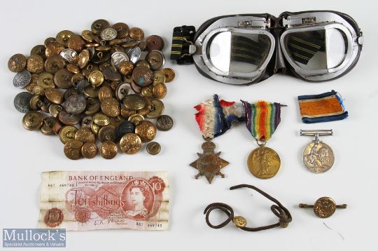 WW1 1914/15 Trio of Medals to M2/073814 Pte D Heald together with a pair of goggles, Folded 10 Shilling Note and quantity of Military Uniform Buttons