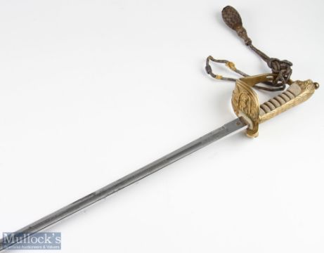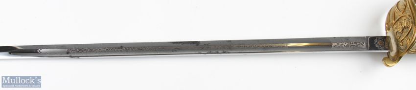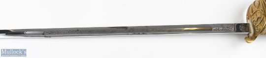 Early 20th century Naval Officer’s Dress Sword by Pote & Sons possibly Edward VII, blade etched with typical designs with King’s crown, marked near hilt Pote & Sons 44 Fore St, Devonport, with brass mounted leather scabbard, blade length 79cm, overall length 95cm