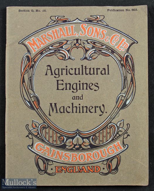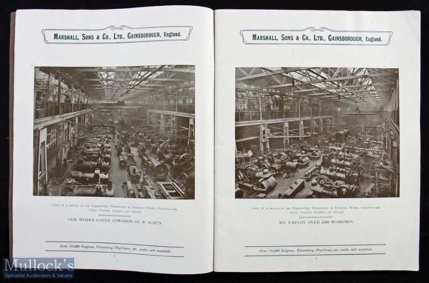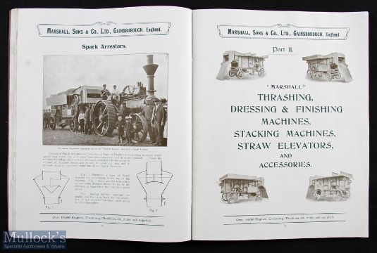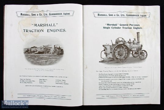 Marshall’s Traction Engines Gainsborough, Lincs. Circa 1912 Sales Catalogue. A scarce large format 64 page catalogue illustrating and detailing with specifications 3 of their Tractions Engines, 5 Portable Engines. Also Thrashing Machines, Straw Elevators and other Steam powered agricultural machinery. Plus 3 full page views of workshops in the Works in Gainsborough. Some staining to a few pages, see illustration, but reflected in reasonable price. Printed on quality semi-gloss paper in card cover size 8¾” x 11”.