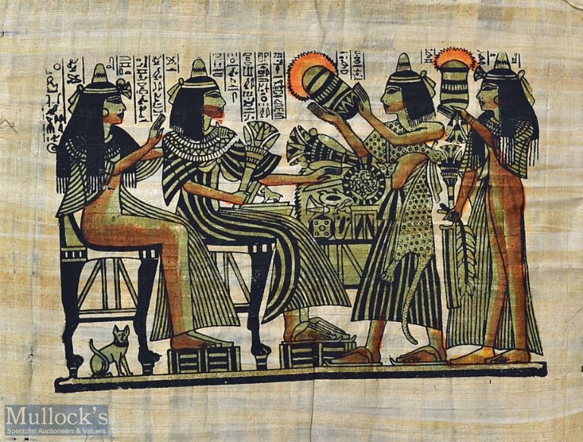 Interesting Egyptian Print – appears on ‘papyrus’, with scenes of females offering gift, measures 40x30cm approx.