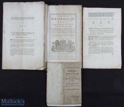 Acts of Parliament including making and maintaining a Navigable Canal from The Saltisford in Parish of Saint Mary to Digbeth, plus Dividing, Alotting and Inclosing the several commons and Waste Lands lying within the Manor of Birmingham, Inclosing lands in the Manor of Knowle plus Descriptive Particular of Manor of Aston freehold estate to be sold by auction 1822 – condition varied A/G overall (4)
