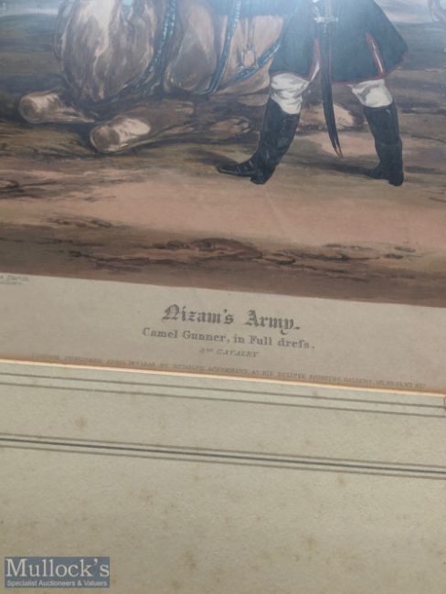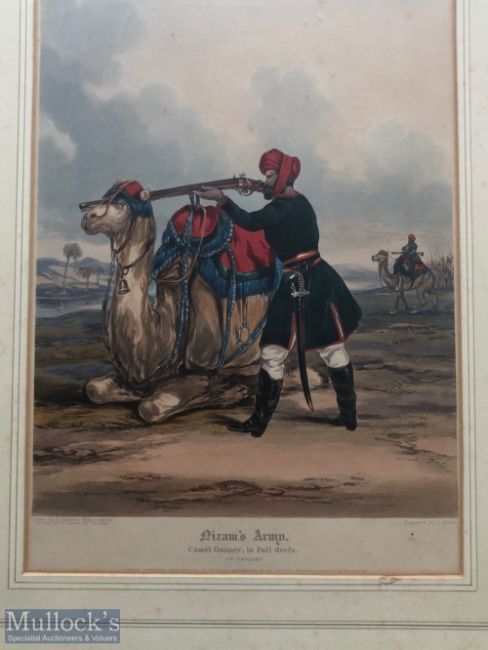 India - large hand coloured steel engraving of the Nizams Army 3rd cavalry camel gunner in full dress. Published in London c1840 by Rudolph Ackermann. Housed in original frame with mount. Dimensions 56 x 43cm