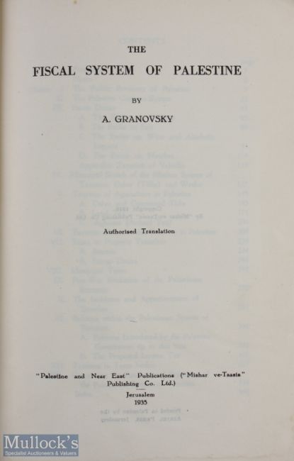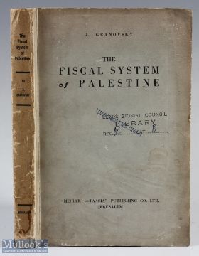 Palestine - The Fiscal System Of Palestine by A. Granovsky. Jerusalem 1935. A 347 page book extensively detailing the comparisons between the previous Turkish method of import and export taxation, and the then British Mandate methods, plus the way to move forward. Published in Palestine. In card cover, size 5” x 9”.
