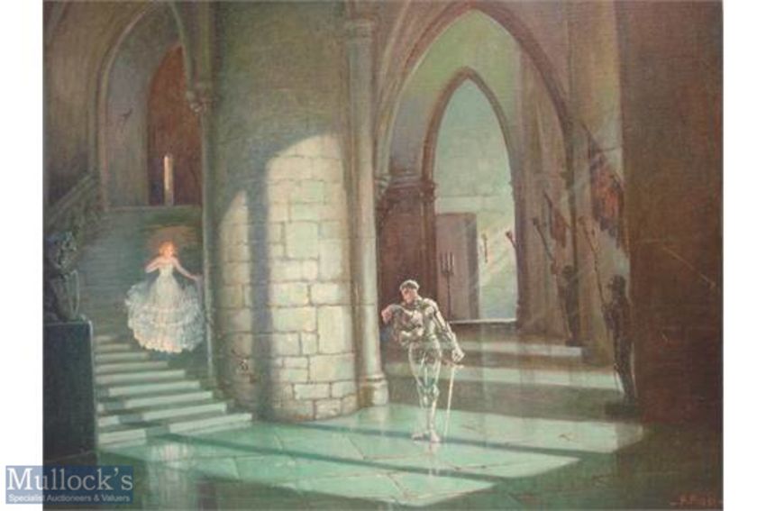 Ferdinand Fissi (1872-1954) Signed Oil on Board depicts a castle interior with a young girl descending down stairs to confront the ghostly knight, measures 85x68c approx. Ferdinand Fissi was born in Greenwich London, on 11th June 1872. He became well known as an illustrator, particularly for motoring publications, also as a scenic artist for studios in Britain and America where he emigrated in 1924. Perhaps his most famous work was the series of illustrations for the account of ‘Jack the Ripper’ which appeared in ‘Famous Crimes’ in about 1903.