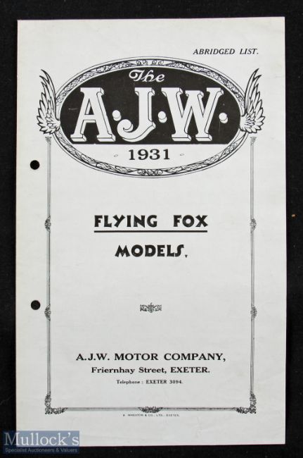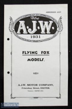 A.J.W. Motor Cycles 1931 Sales Catalogue. A period 4 page Sales Catalogue, illustrating three machines and detailing with prices their range of 10 machines from 172cc Black Fox for £37 to 996 cc Motor Cycle for £170. Small manufacturer, made in Exeter. Printed on semi gloss paper, size 6” x 9 ¾”.