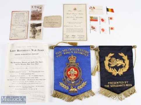 Small Collection of Military Paperwork - Red Cross Fundraising Pin Badges, Red Cross Agricultural Rural Pennies Certificate, Lady Mayoress of Birmingham Concert Sheet, 1919 Military Pass in India to Pte Collyer and two military pennants.