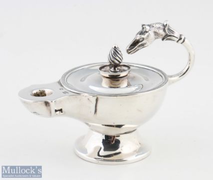 Victorian Mappin & Webb Hallmarked Silver Table Lighter Aladdin’s Lamp with horse head design handle, hallmarked London 1899, good overall condition with foot slightly uneven, height 9cm, weight 165 grams
