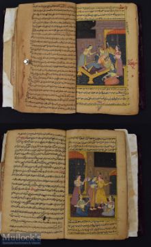 India-Persia Manuscript with Miniature Paintings - a Persian manuscript with 10x Indian Miniatures painted over the manuscript, c19th century, browned due to paper, partly slightly stained and with small defects in places. Miniatures well preserved, impressive Indian Illuminated miniature over a Persian manuscript. Various court scenes