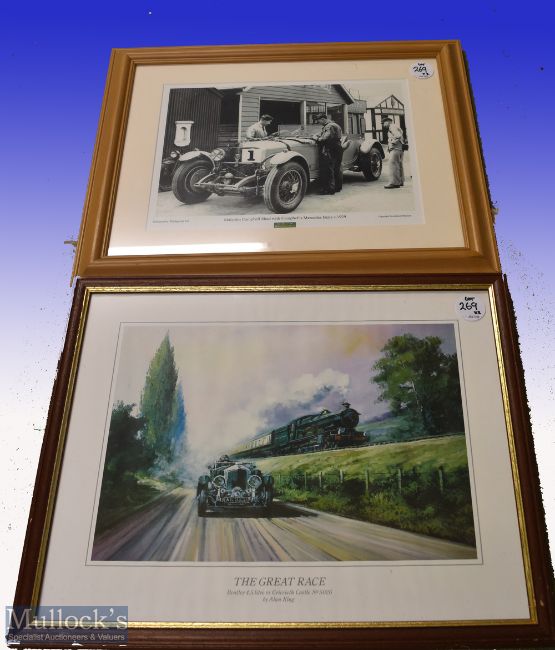 Motor Racing Prints: Malcolm Campbell Shed with Campbell’s Mercedes Benz c 1929 together with The Great Race Bentley 4.5 vs Criccieth Castle Locomotive f & g both 46 x 56cm (2)