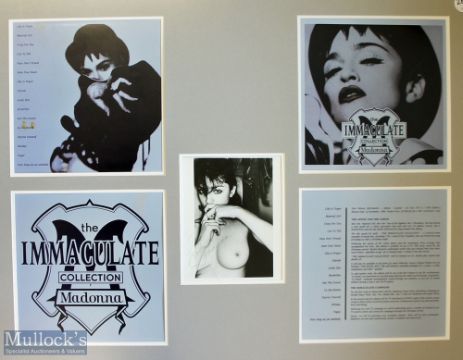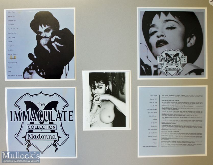 Autograph - Madonna Signed black and white print signed ‘Love Madonna’ centrally displayed with surrounding print ephemera, mounted framed and glazed, overall measures 102 x 83cm approx.